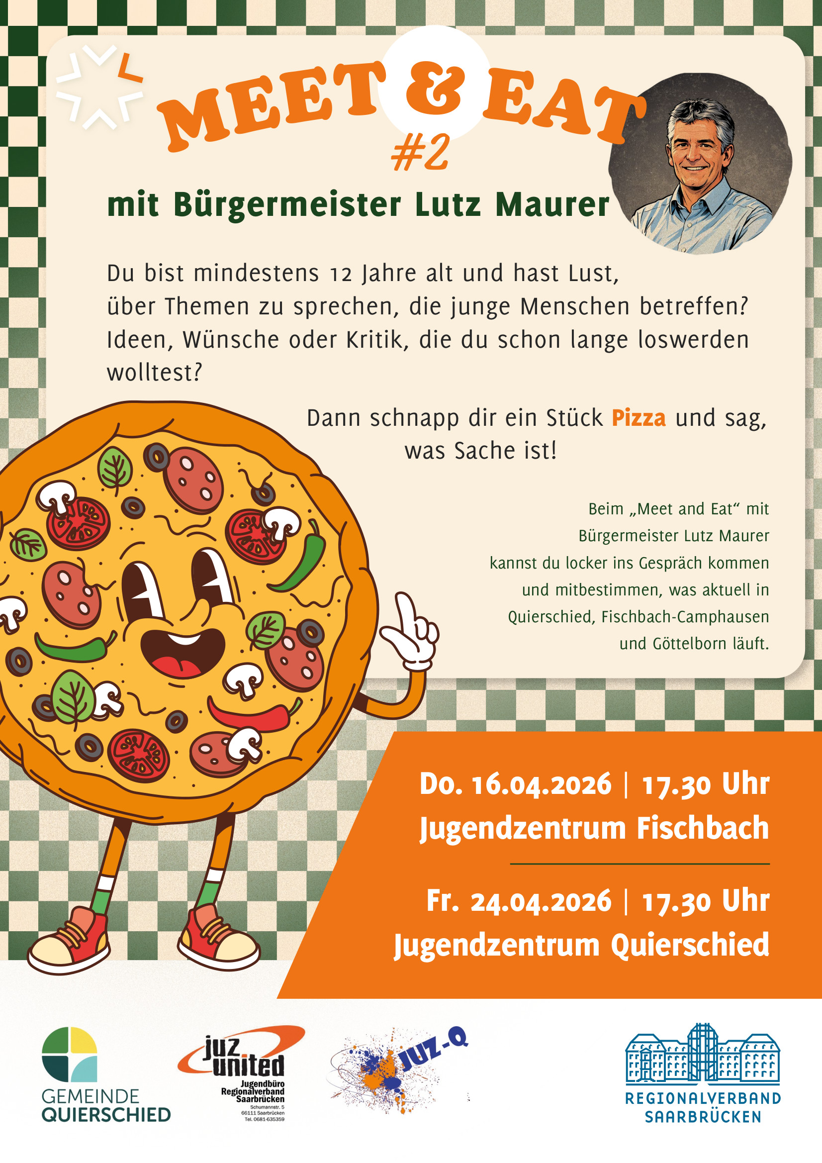 Komm‘ zum „Meet & Eat“ mit Bürgermeister Lutz Maurer Du bist mindestens 12 Jahre alt und hast Lust, mit dem Bürgermeister über Themen zu sprechen, die DICH interessieren?Ob Ideen, Wünsche…