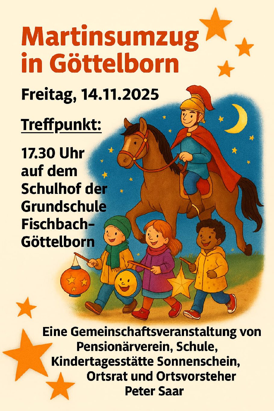 Traditioneller Martinsumzug in Göttelborn am 14.November 2025Die Aufstellung des Zuges erfolgt ab 17.45 Uhr auf dem Schulhof derGrundschule Fischbach-Göttelborn wie folgt:Angeführt wird der Zug von St. Martin auf dem Pferd.…