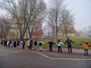 Am Montag, 10. November 2025, bildeten unter anderem Schülerinnen und Schüler und Lehrkräfte der Gemeinschaftsschule Quierschied im Bereich der Straßen Im Eisengraben und Schumannstraße eine Menschenkette. Zahlreiche Menschen aller Altersgruppen standen durch ihre Teilnahme für Demokratie und Toleranz sowie Stärkung des Miteinanders in der Gemeinde Quierschied ein. Die Aktion erinnerte als Teil des Programms „Schule des Erinnerns“ an die sogenannte Reichsprogromnacht der Nazis vom 9./10. November 1938.