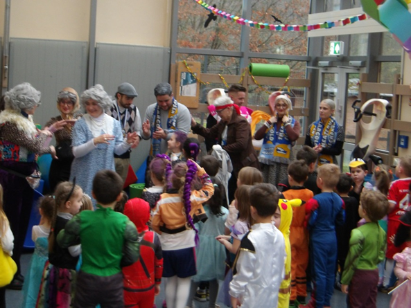 Anschließend stieg in der Turnhalle eine riesige Party. Ein ganz besonderes Highlight war der Besuch des Karnevalsvereins Saargold. Gemeinsam mit ihnen tanzten die Kinder fröhlich zu bekannten Faschingsliedern, machten eine lange Polonäse durch die ganze Kita und sangen ausgelassen mit. Natürlich durften auch die typischen Faasendguddzjer nicht fehlen, die mit viel Begeisterung geworfen und eingesammelt wurden.