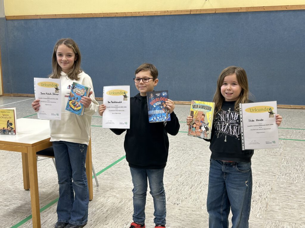 Damit ist Ben unser Schulsieger und wird unsere Schule in der nächsten Wettbewerbsrunde gemeinsam mit anderen Schulen vertreten. Wir gratulieren Ben herzlich und danken auch Jana und Tilda für ihre hervorragenden Leistungen. Der Wettbewerb zeigte eindrucksvoll, wie viel Freude Lesen machen kann.